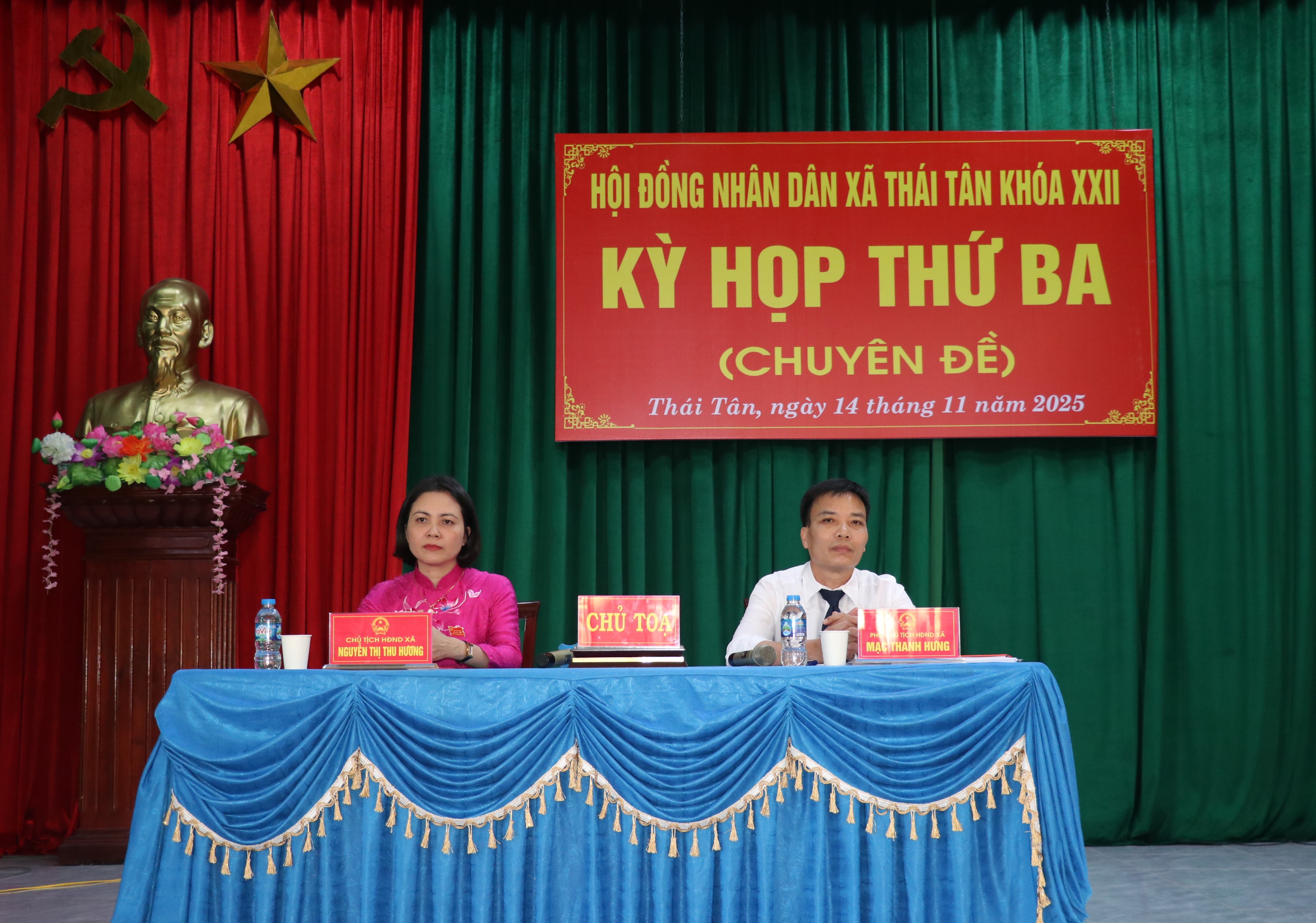 Chiều ngày 14/11/2025, tại hội trường xã Thái Tân (thôn Cõi Hưng Sơn), Hội đồng nhân dân xã Thái Tân khóa XXII, nhiệm kỳ 2021-2026 đã tổ chức Kỳ họp thứ Ba (kỳ họp chuyên đề). Các đồng chí: Nguyễn Thị Thu Hương – Bí thư Đảng ủy, Chủ tịch HĐND xã; Mạc Thanh Hưng – Ủy viên Ban Thường vụ, Phó Chủ tịch HĐND xã đồng chủ tọa kỳ họp.