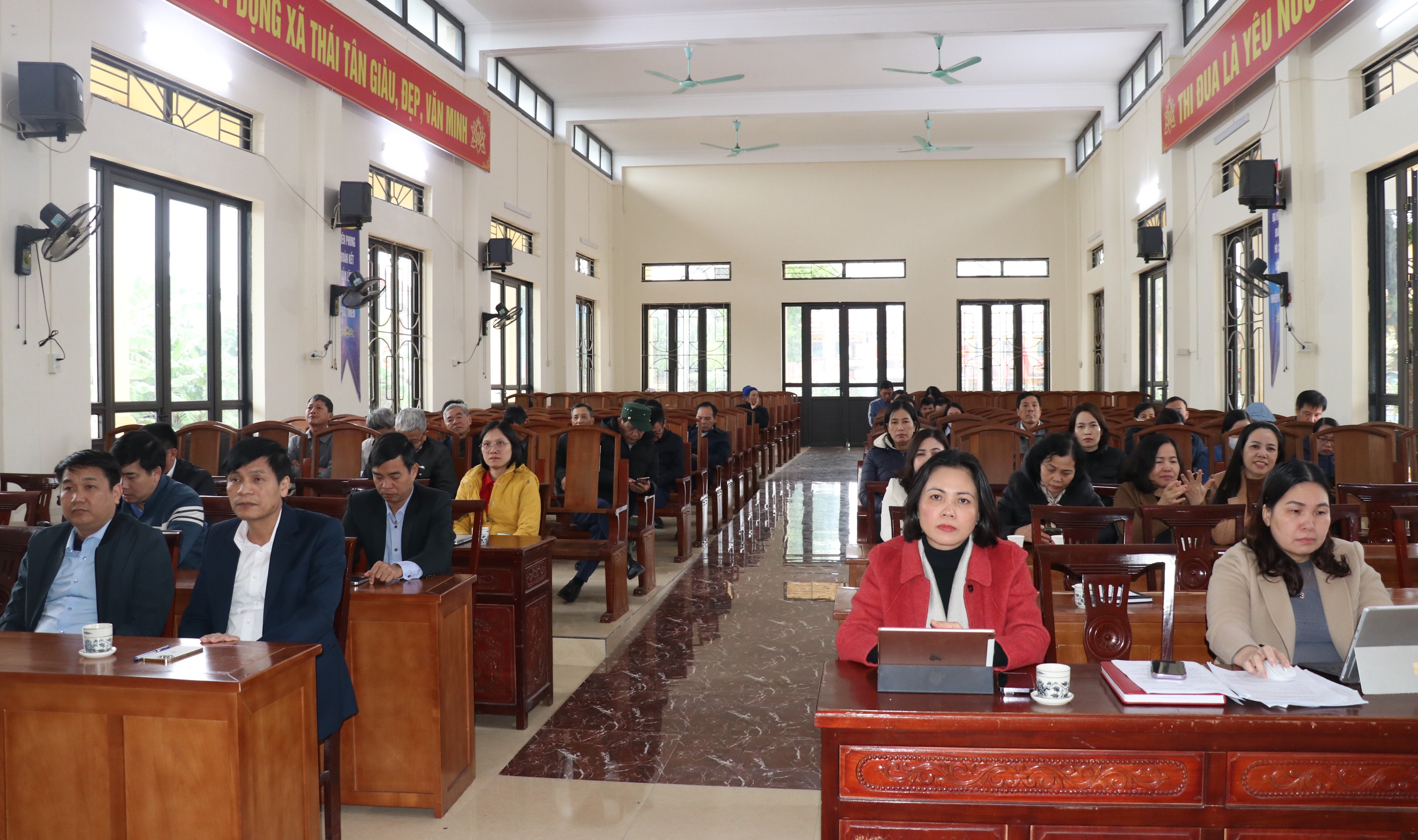 Tham dự tại điểm cầu xã Thái Tân có các đồng chí: Nguyễn Thị Thu Hương - Bí thư Đảng uỷ, Chủ tịch HĐND xã; Đặng Văn Duy - Phó bí thư, Chủ tịch Uỷ ban Nhân dân xã; các đồng chí trong Ban Thường vụ Đảng uỷ, Ban Chấp hành Đảng bộ xã, Trưởng các ban, ngành đoàn thể, bí thư chi bộ, hiệu trưởng các trưởng học, trạm y tế.