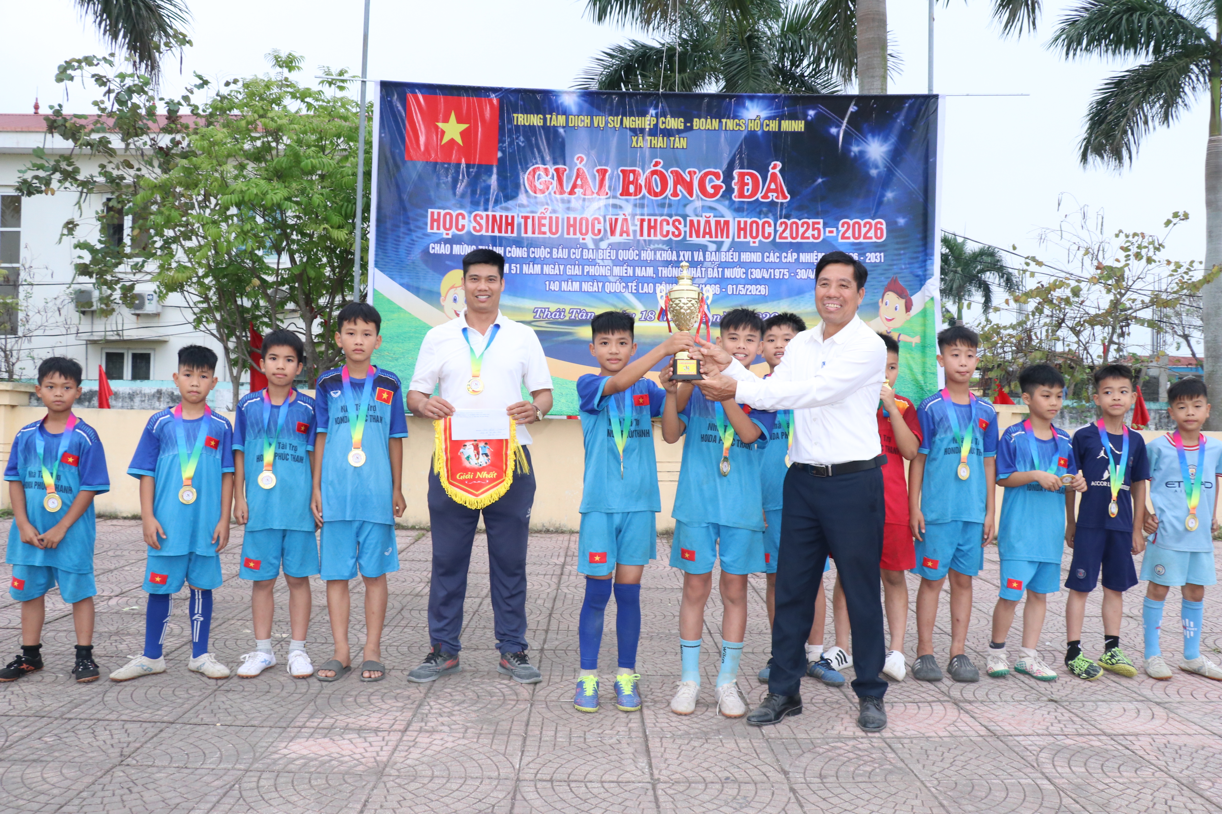 Sau một ngày tranh tài sôi nổi, giải bóng đá nam học sinh xã Thái Tân năm học 2025 - 2026 đã khép lại thành công tốt đẹp. Ban Tổ chức đã trao giải cho các đội. Trong đó, giải Nhất khối Tiểu học thuộc về đội Trường Tiểu học và THCS Nguyễn Đức Sáu; giải Nhất khối THCS được trao cho đội tuyển Trường THCS Thái Tân.