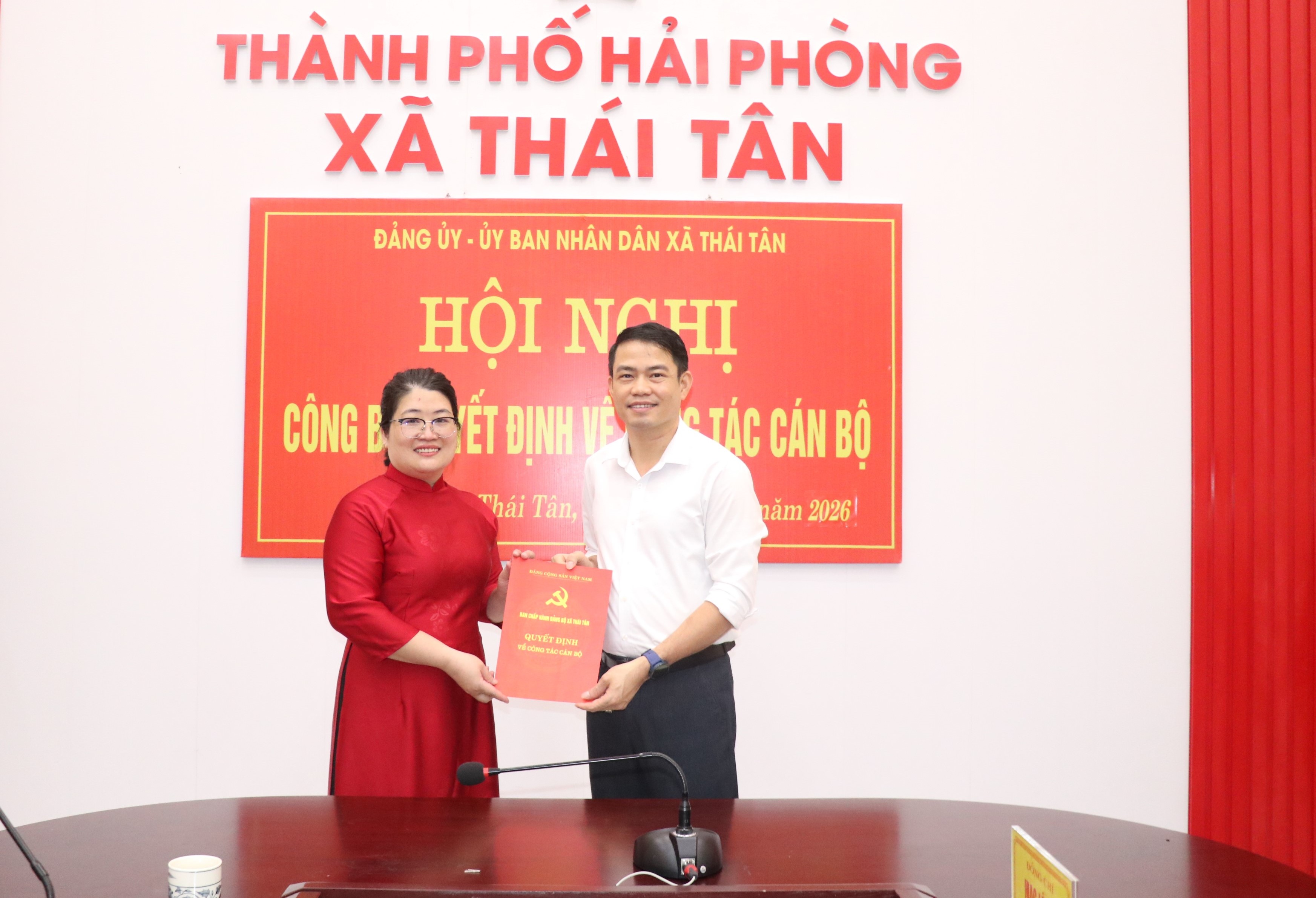 Tại hội nghị, đồng chí Mạc Thanh Hưng - Uỷ viên Ban Thường vụ, Trưởng Ban Xây dựng Đảng và đồng chí Nguyễn Thị Tố Uyên - Đảng uỷ viên, Trưởng phòng Văn hoá - Xã hội xã Thái Tân đã công bố các quyết định về công tác cán bộ. Theo Quyết định số 138-QĐ/ĐU của Ban Thường vụ Đảng uỷ, đồng chí Vũ Thị Miện, Chuyên viên Ban Xây dựng Đảng được bổ nhiệm giữ chức vụ Phó Trưởng Ban Xây dựng Đảng, thời hạn 5 năm, kể từ ngày 15/4/2026.