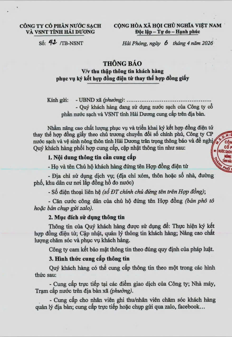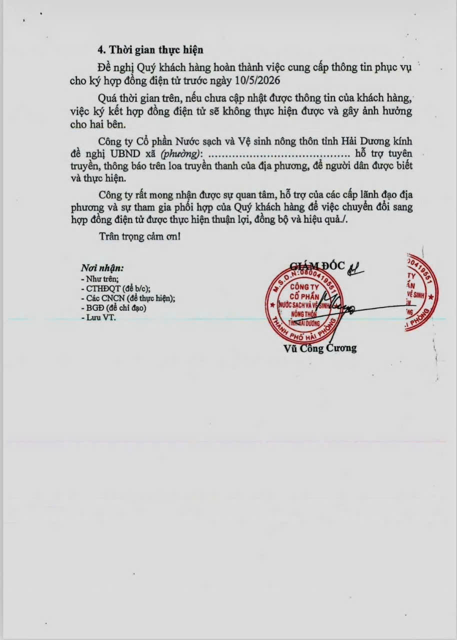 Để việc ký kết hợp đồng điện tử được thực hiện thuận lợi, đề nghị các hộ dân đang sử dụng nước sạch phối hợp cung cấp và cập nhật thông tin khách hàng với các nội dung sau: